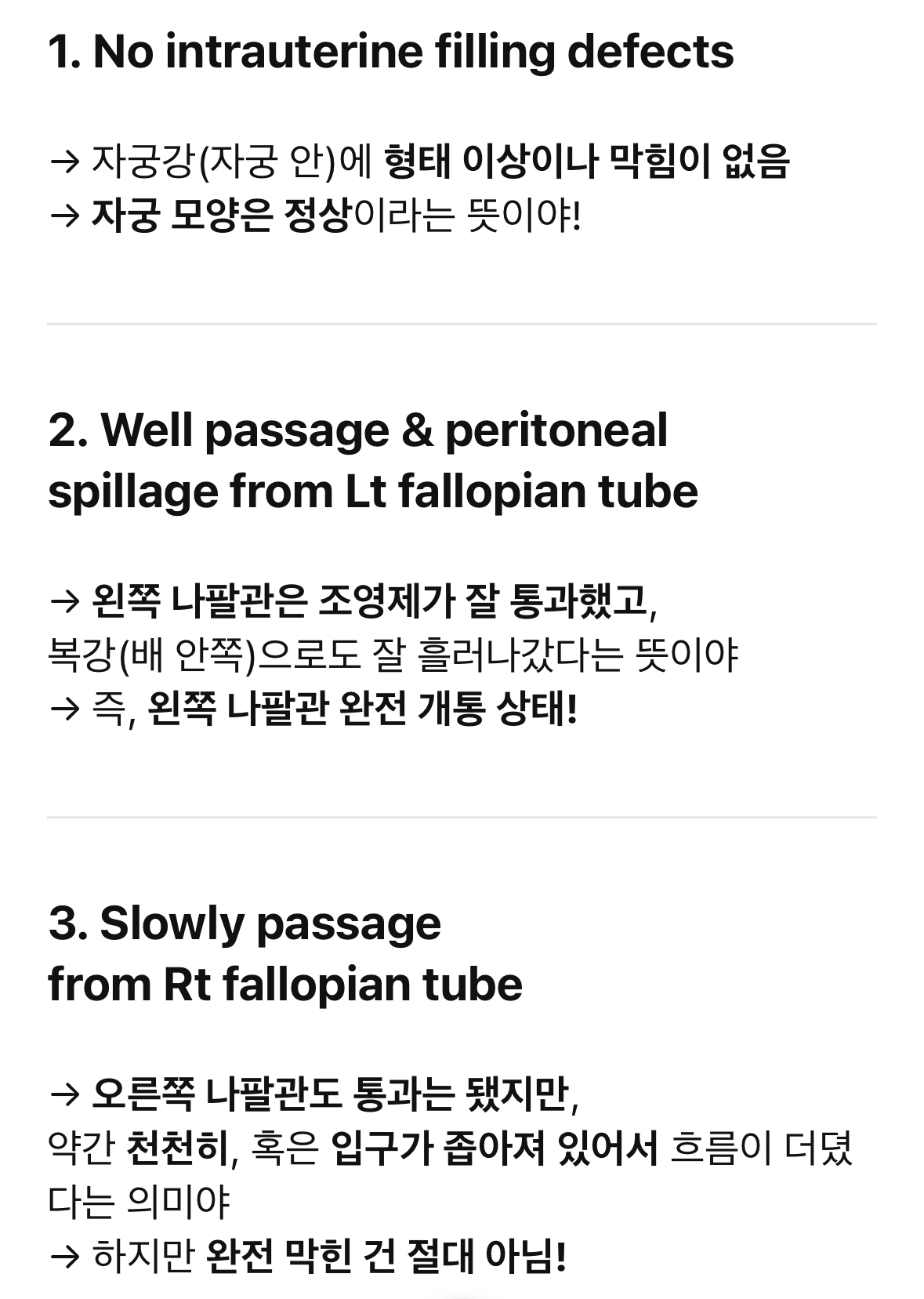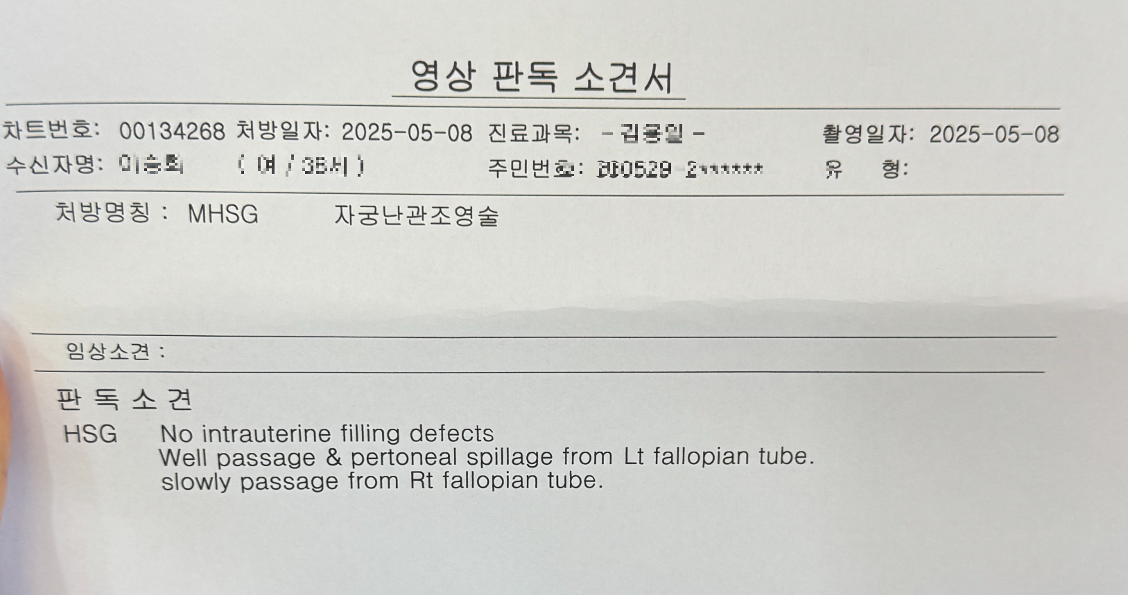 검사 후 바로 의사에게 결과를 듣습니다. 저는 다행히 양쪽 나팔관 모두 개통 상태였고, 자연임신 시도 가능하다는 소견을 받았습니다.