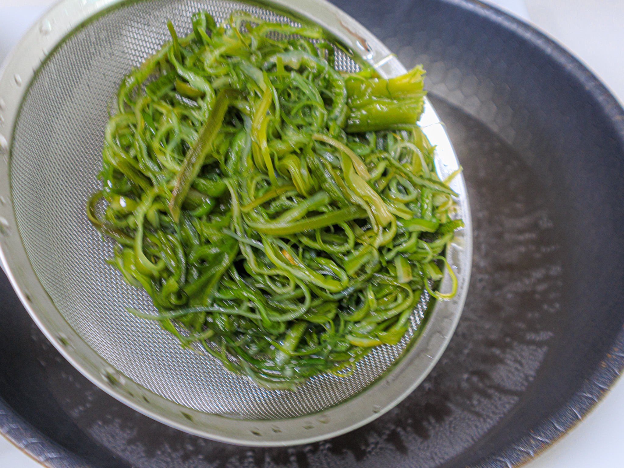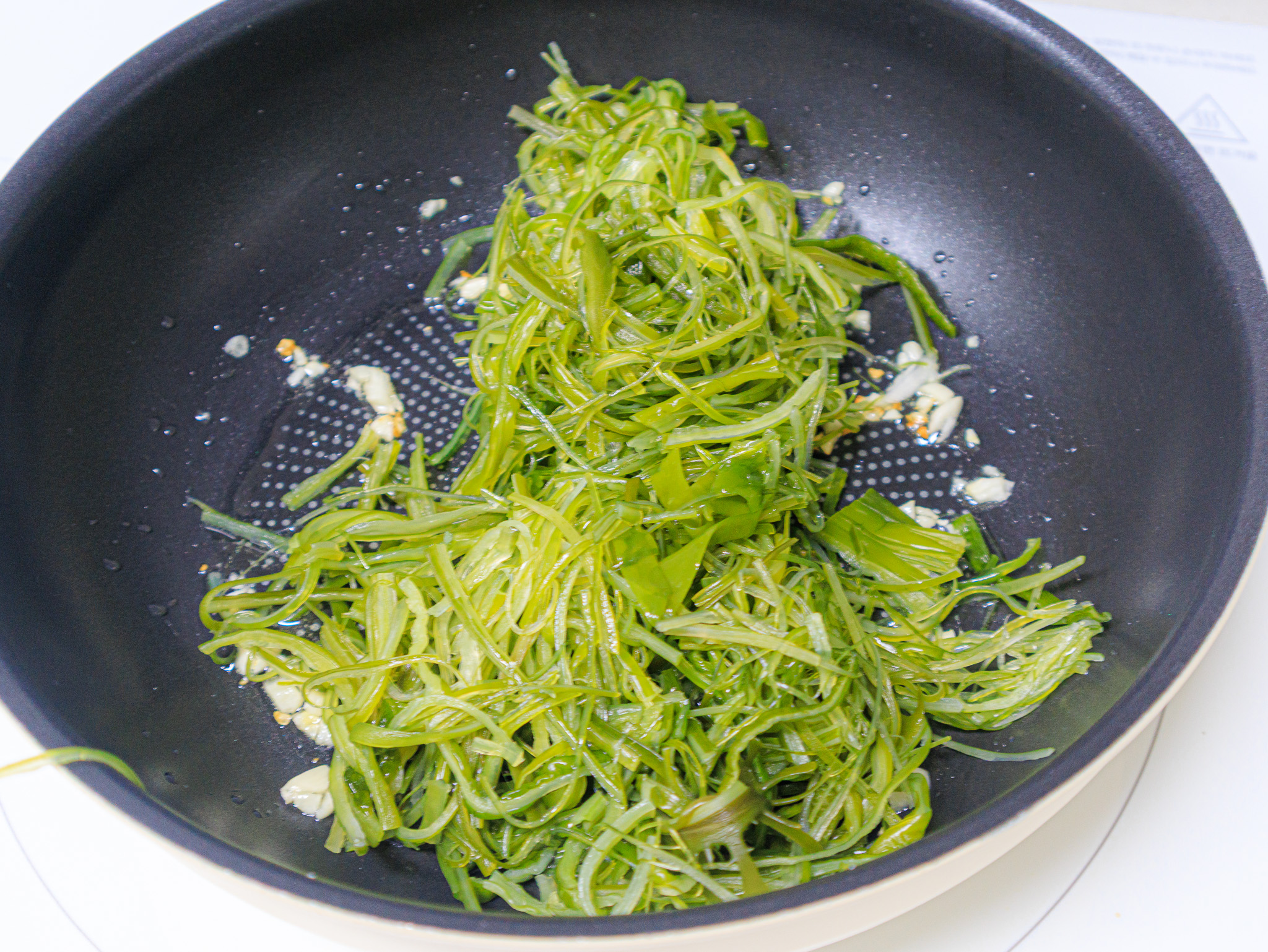 4. 미역줄기를 넣어 마늘기름에 30초간 코팅시켜줘요.