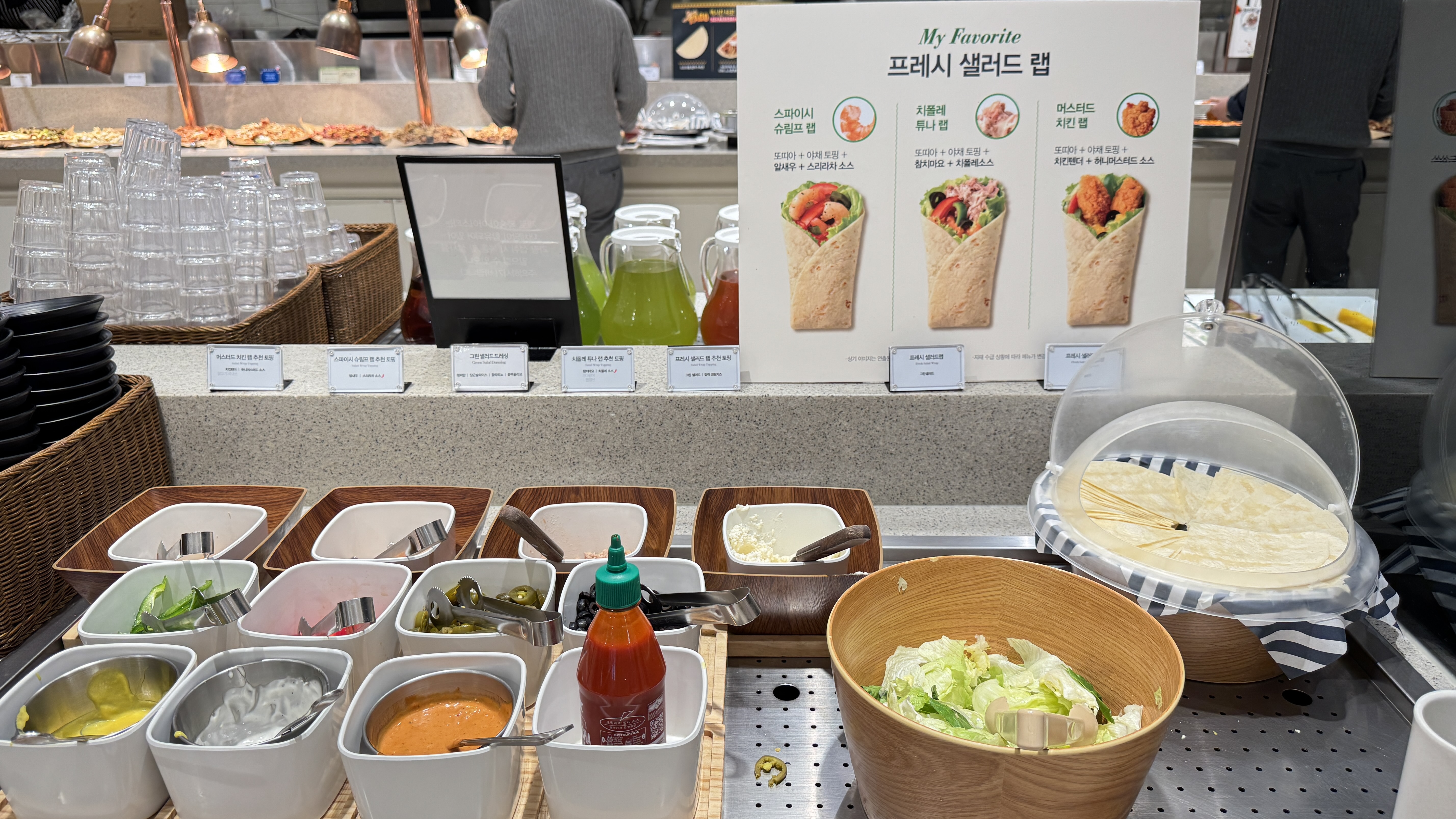 또띠아랩에 직접 토핑해서 싸먹을수도 있어요.