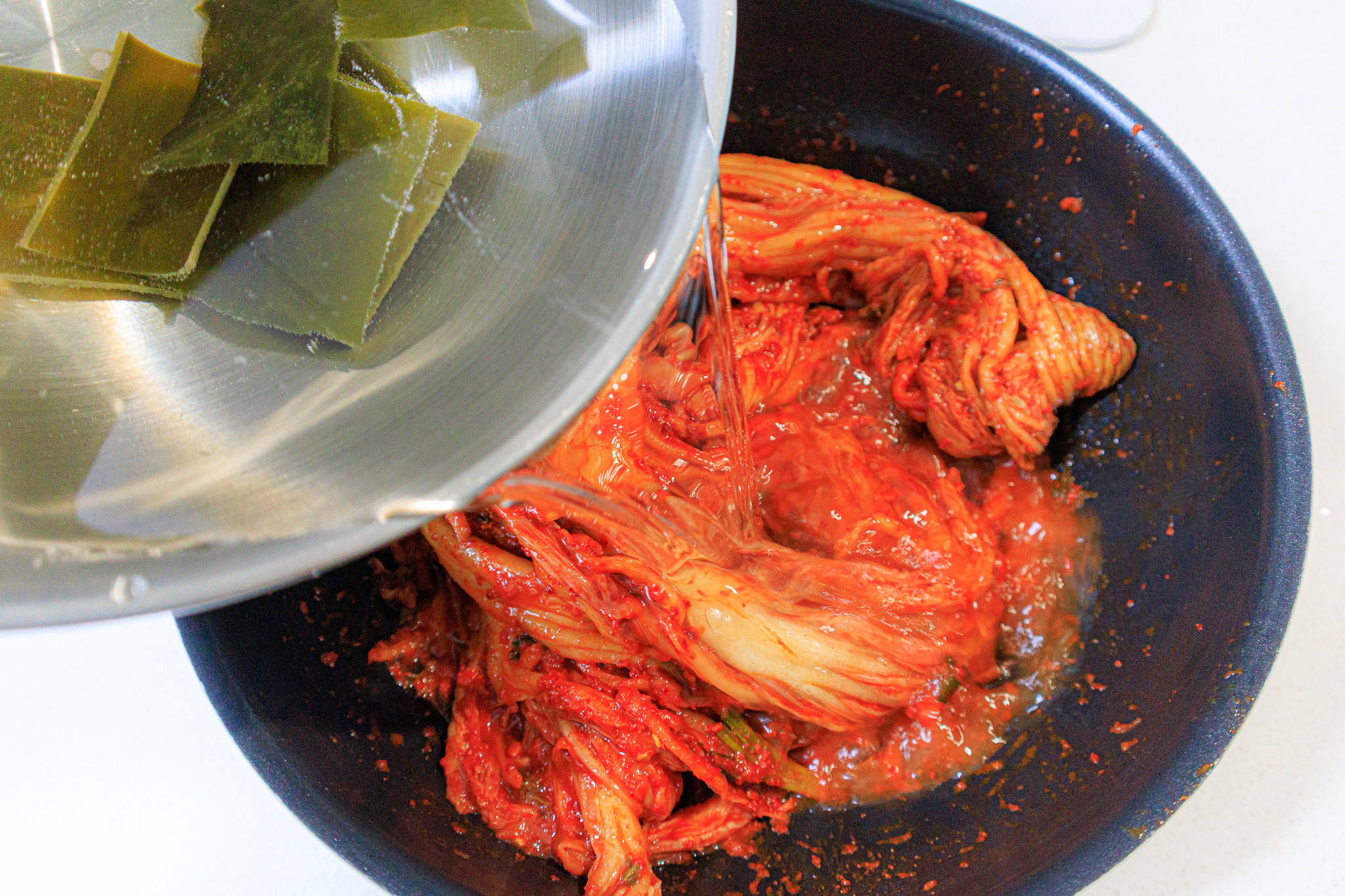 냄비에 신김치를 담고, 다시마물을 김치가 잠길 만큼 부어 주세요.
