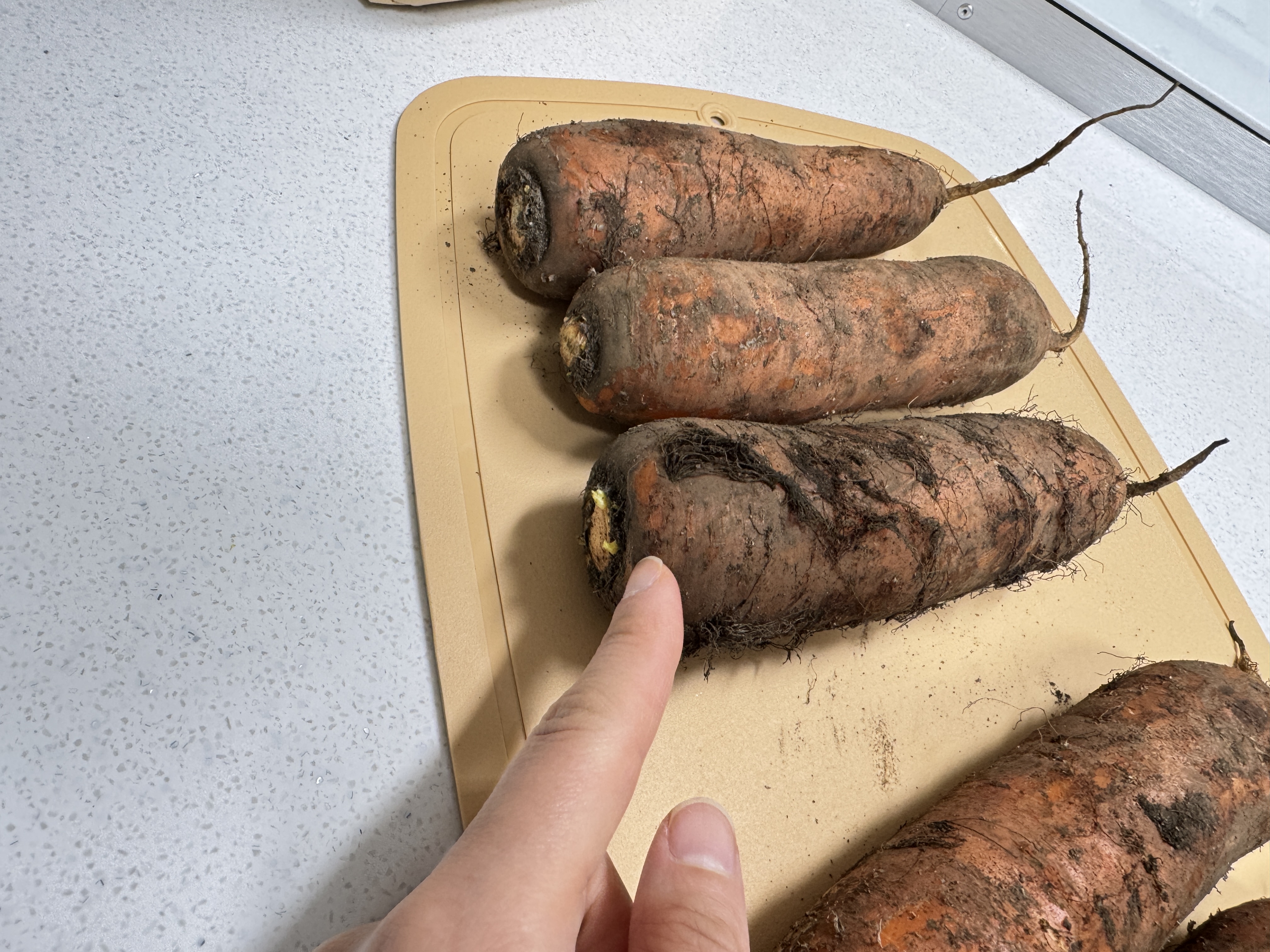 생장점은 당근의 뿌리가 나는 끝 부분이에요. 이부분을 자르지 않으면, 뿌리가 계속 자라서 당근의 영양이 줄어들어요.