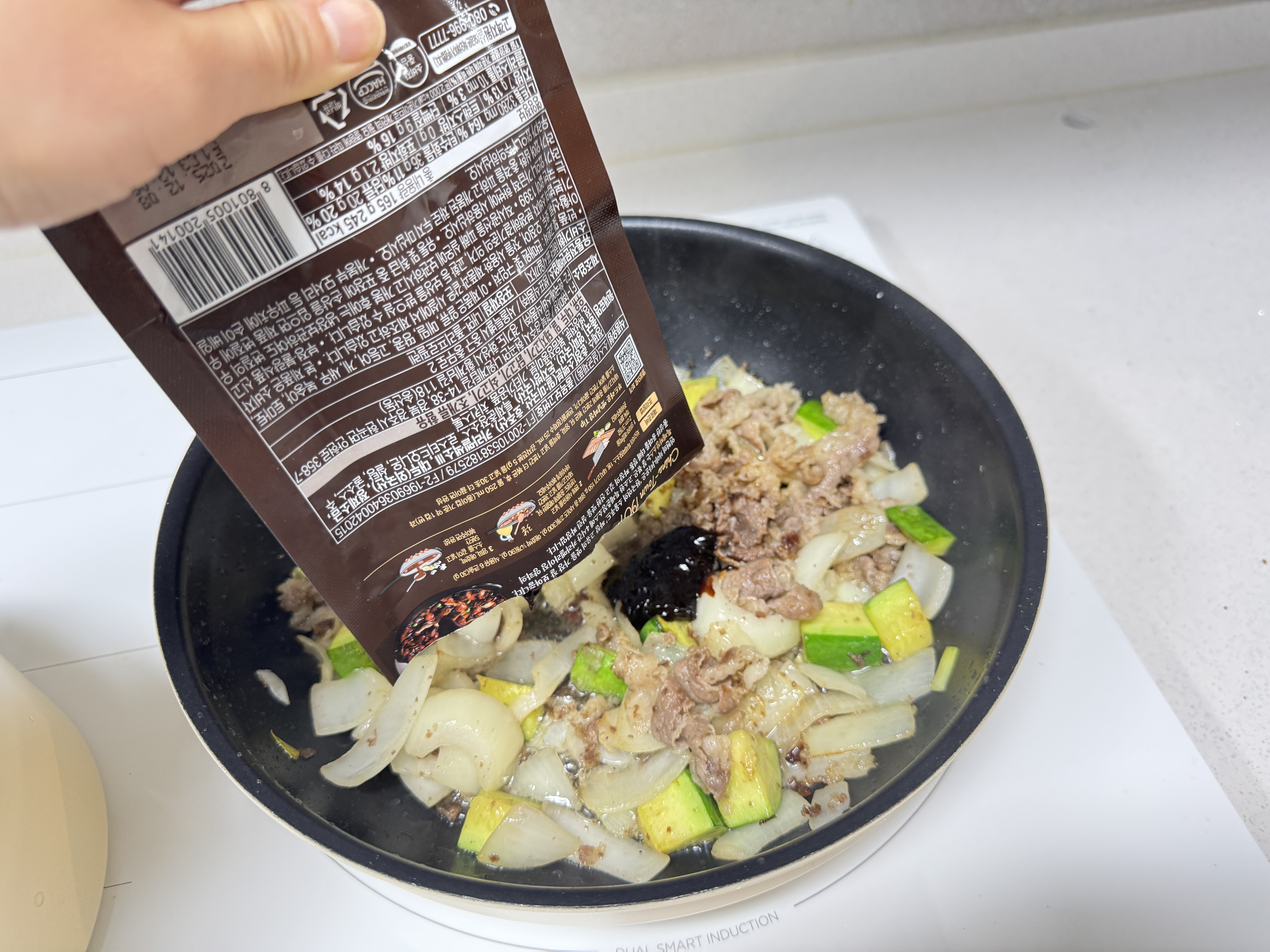 2. 고기가 노릇하게 구워지면, 양파와 애호박 넣고, 소스도 넣어서 5분간 볶아줘요.