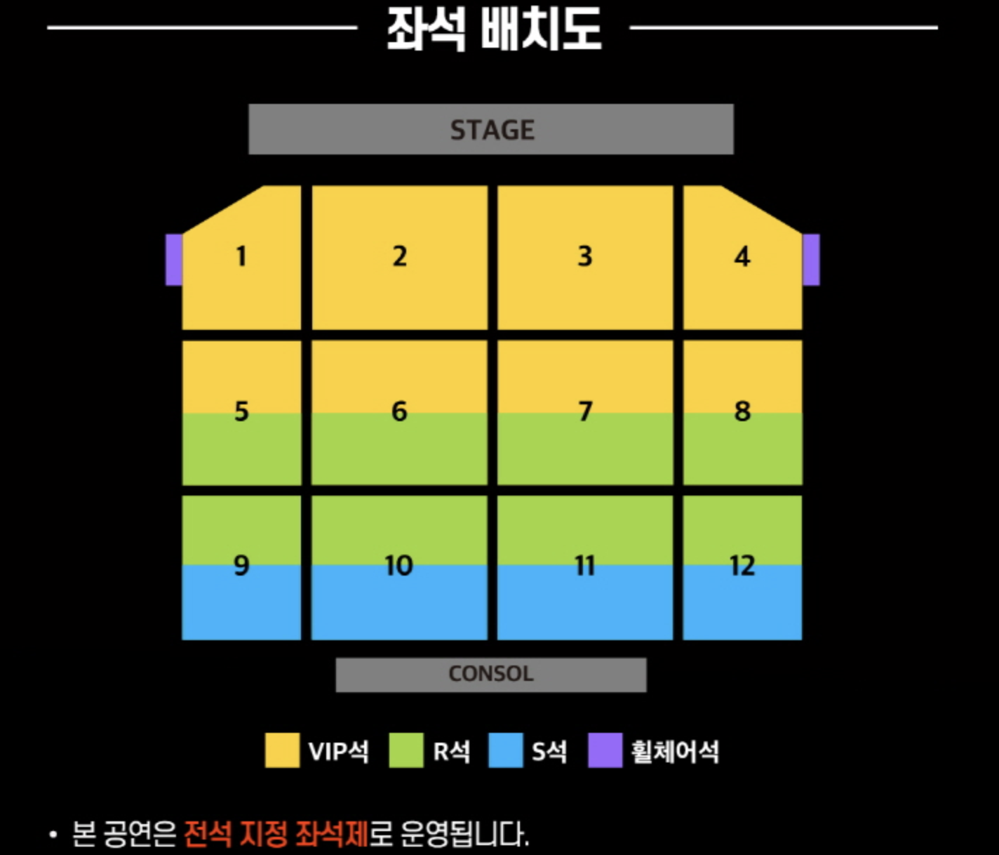 - 시야 제한: 무대 연출에 따라 일부 좌석에서 시야 제한이 있을 수 있으니 예매 시 참고하시기 바랍니다.